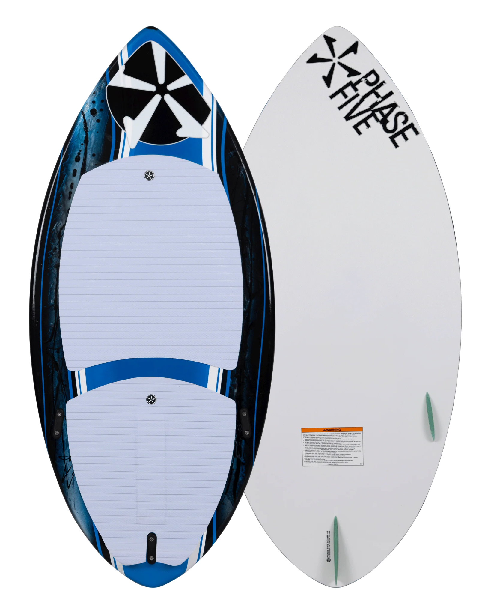 The kids Phase Five Scamp Wakesurfer uses a wide stable profile that carries the right amount of momentum to stay in the wave. The thin ½” skim style core provides exceptional float and maintains excellent rail sensitivity for the lighter rider. The tri-fin setup is configured with our 2” Skim Fin in the center, and Fakie 1” Skim Fins on the sides. This fin configuration locks the Scamp into the wave with plenty of drive and helps it turn on a dime. The Phase Five Scamp Wakesurfer is a great starting platform for young riders.