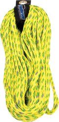 The 60’ 2-Rider Safety Tube Rope features 3/8” Poly-E rope with minimal stretch, UV protection, and woven reflective tape for visibility in low light. The braided floating neoprene strand ensures buoyancy, and it includes a rope keeper for convenient storage and towing two riders safely. Bright yellow line with blue highlights.